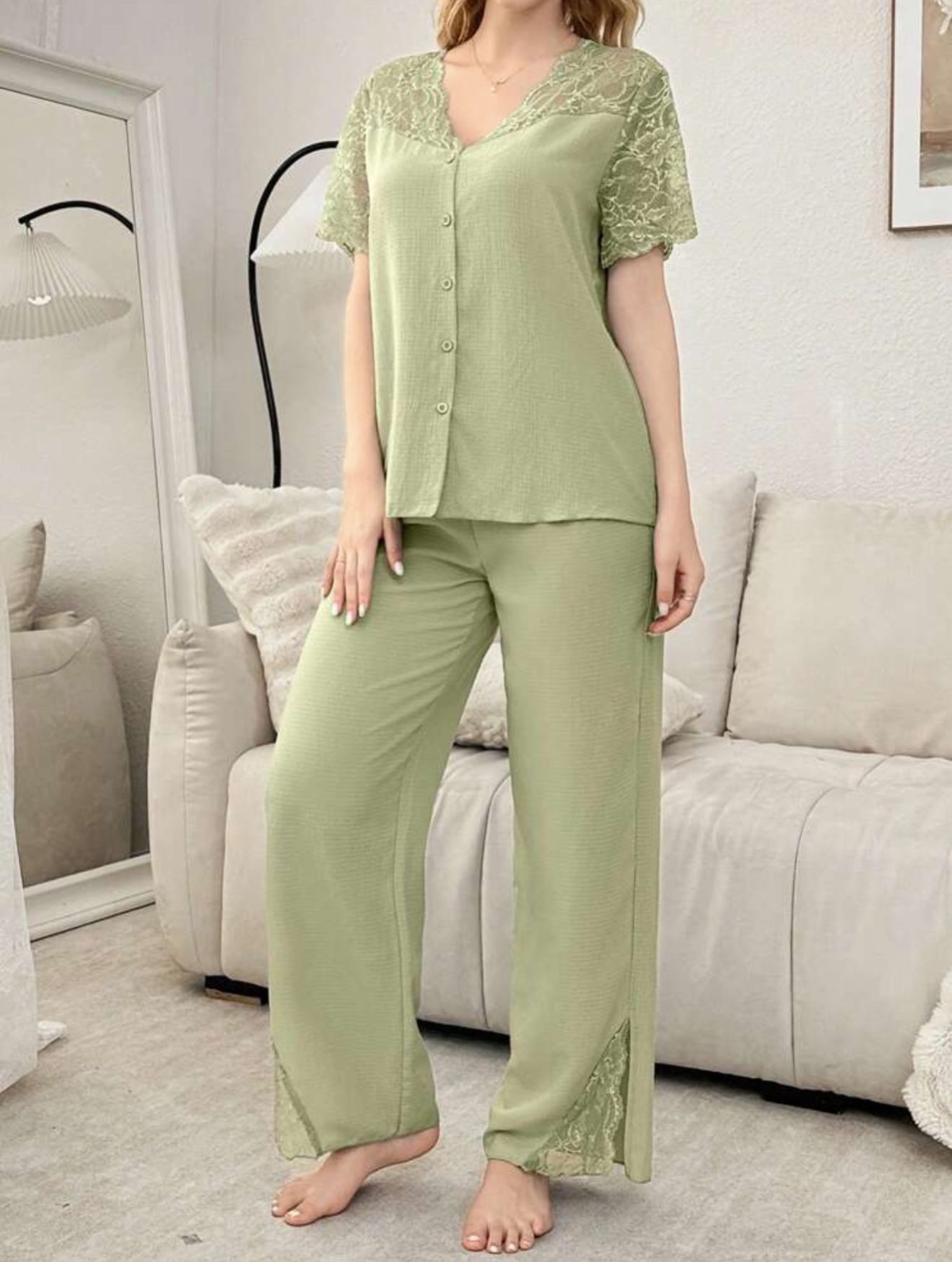 دارای تزیینات گیپور در ناحیه یخن,آستین و پاچه شلوار که جلوه شیک و زنانه ایجاد کرده است