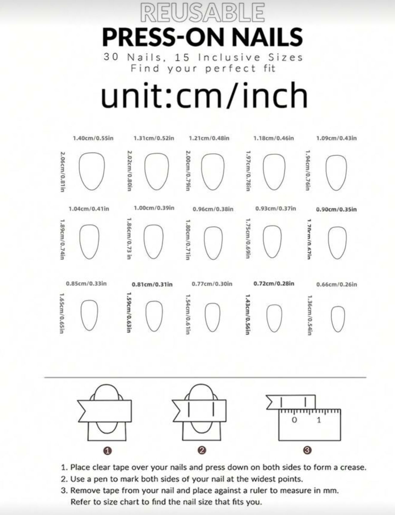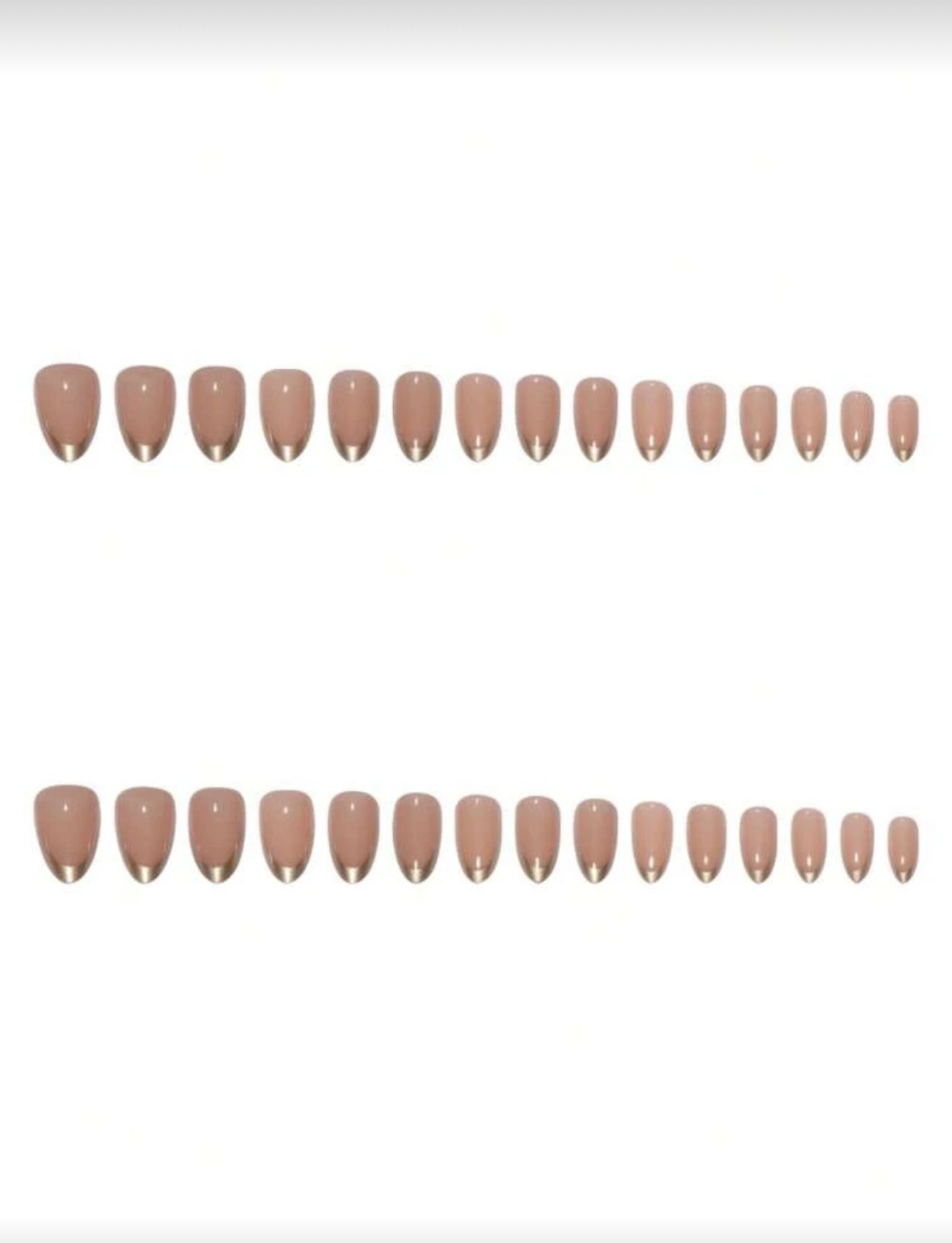 این مجموعه شامل ۳۰ عدد ناخن مصنوعی با طراحی طلایی فرنچ استایل بوده که دارای شکل بادامی (almond) و اندازه کوتاه میباشد. از بهترین مواد ساخته شده تا درخشش طبیعی، دوام بالا و راحتی در استفاده را برایتان فراهم کند. این ناخنها بهگونهای طراحی شدهاند که در چند دقیقه ظاهری شیک و مرتب به دستان شما میبخشند.
