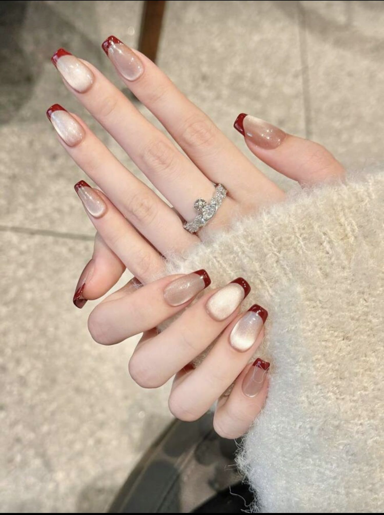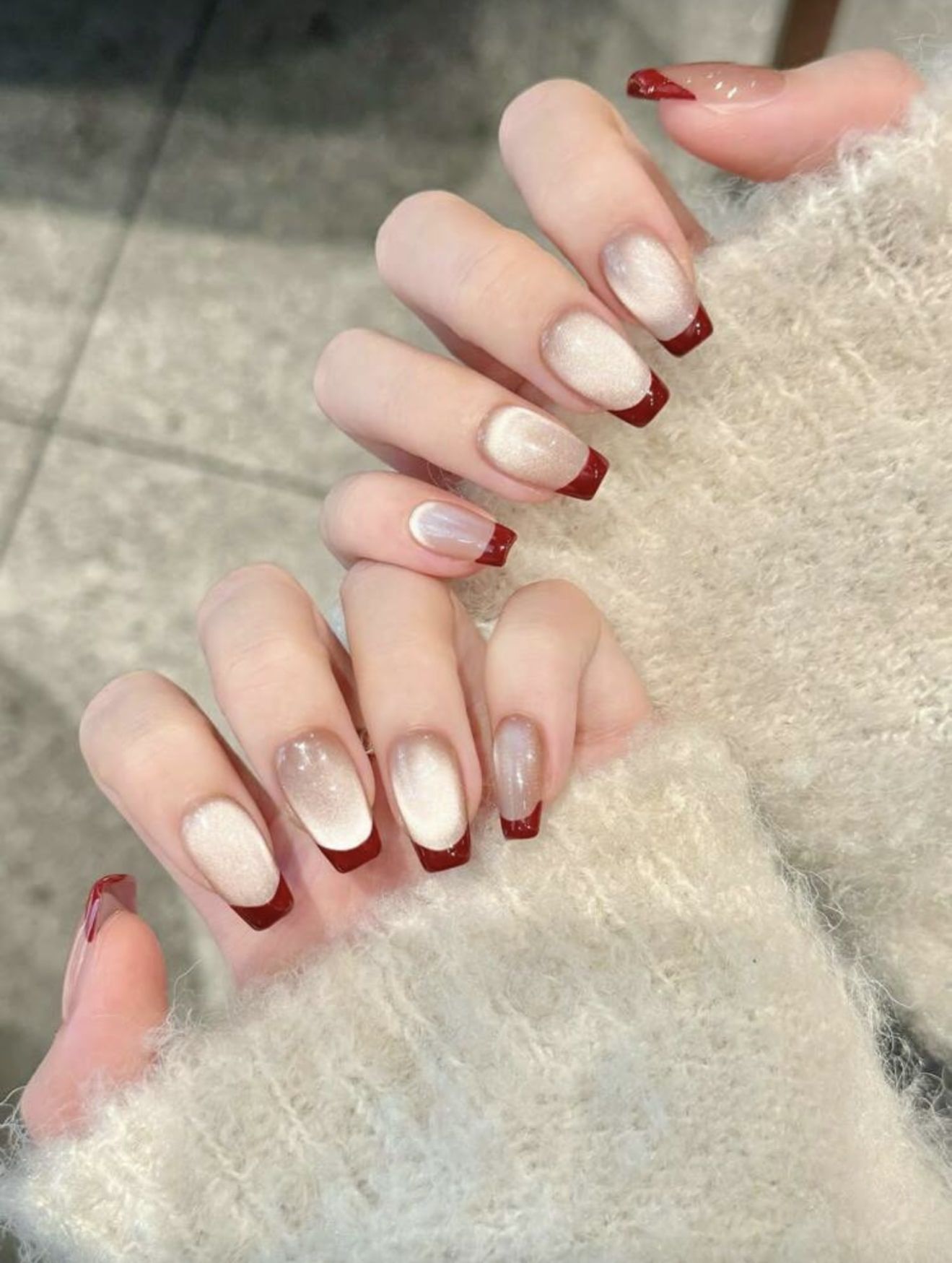 رنگ سرخ شرابی (Burgundy Red) در ترکیب با طرح Cat Eye فرانسوی، حس لوکس و مرموزی به دستانت میدهد.