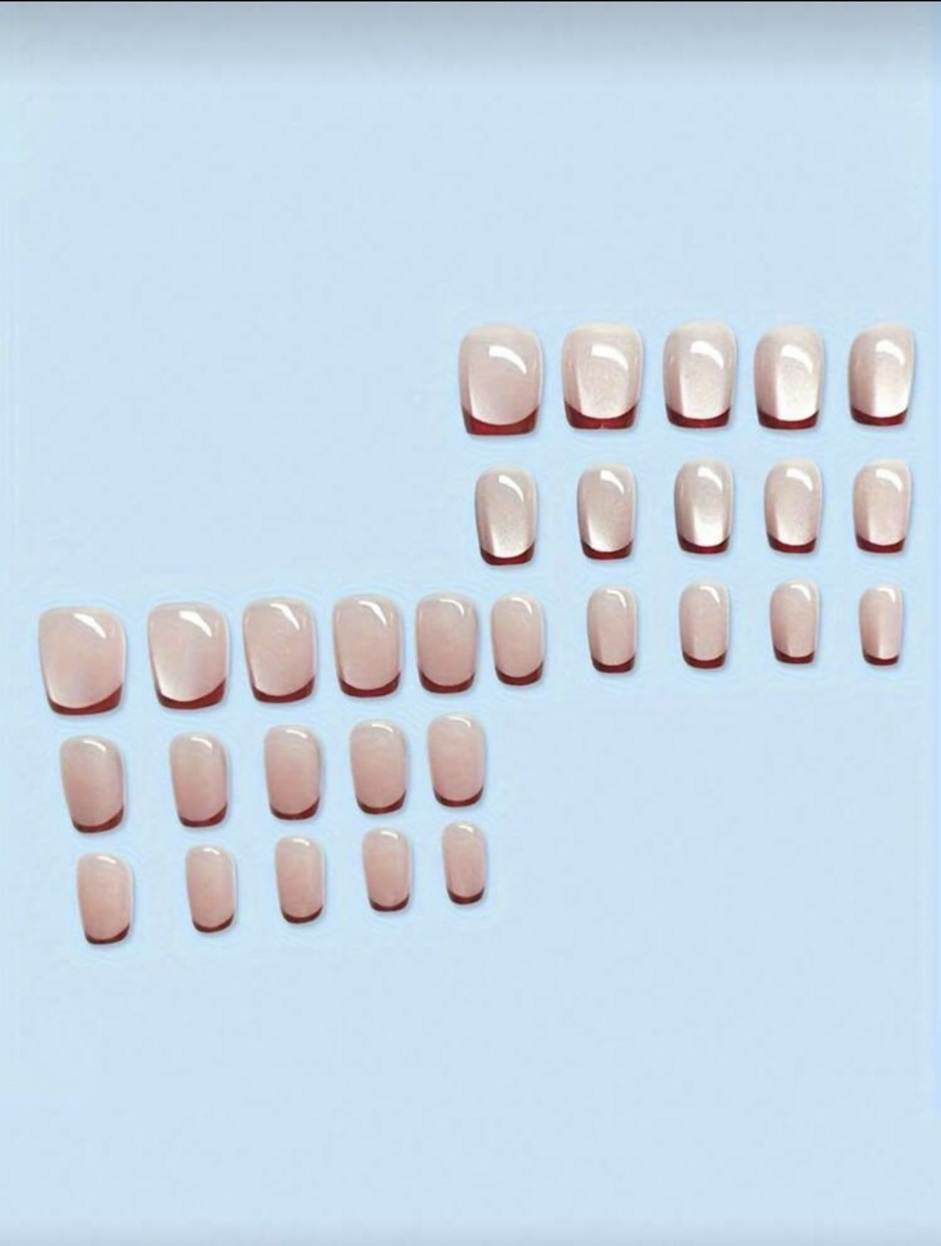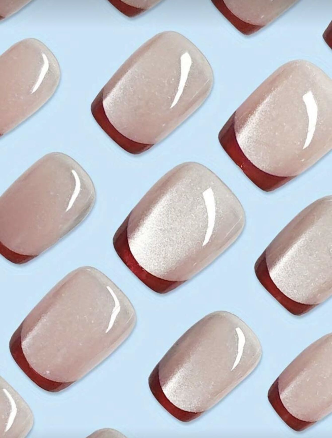 با این ست ۲۴ عددی ناخن مصنوعی فرنچ، استایلی کلاسیک و شیک برای دستان خود بسازید. نوک قرمز مربعی همراه با پوشش براق، جلوهای جذاب و مدرن به ناخنها میدهد.